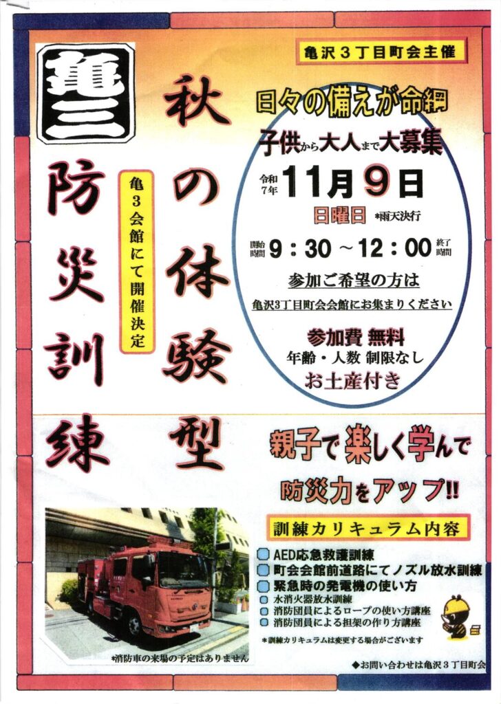 秋の防災訓練が開催されます。ぜひご参加ください!日にち 11月9日 日曜日時間 9:30-12:00参加費無料 年齢・人数制限なし お土産付きです -