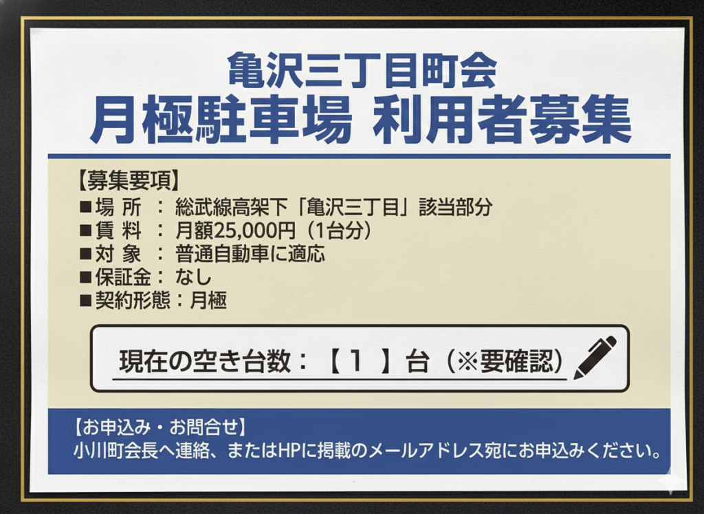 亀沢三丁目町会 月極駐車場の利用者を募集しています。