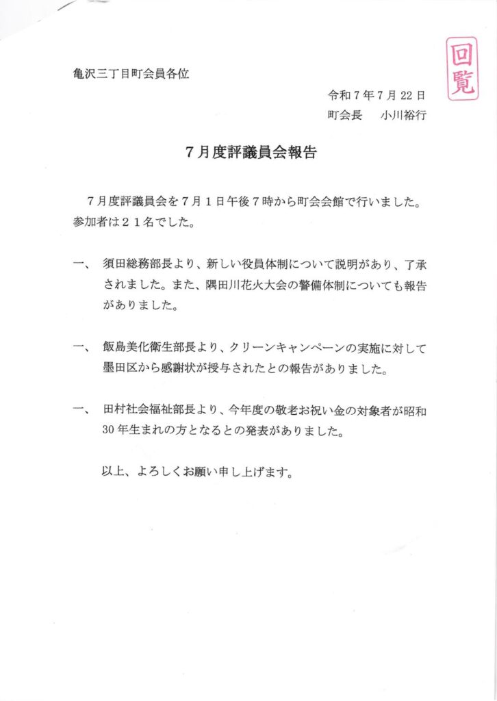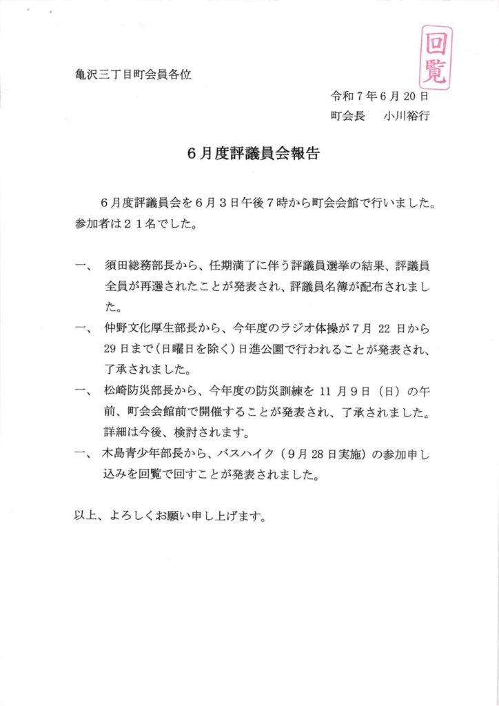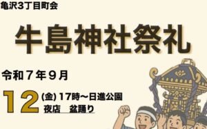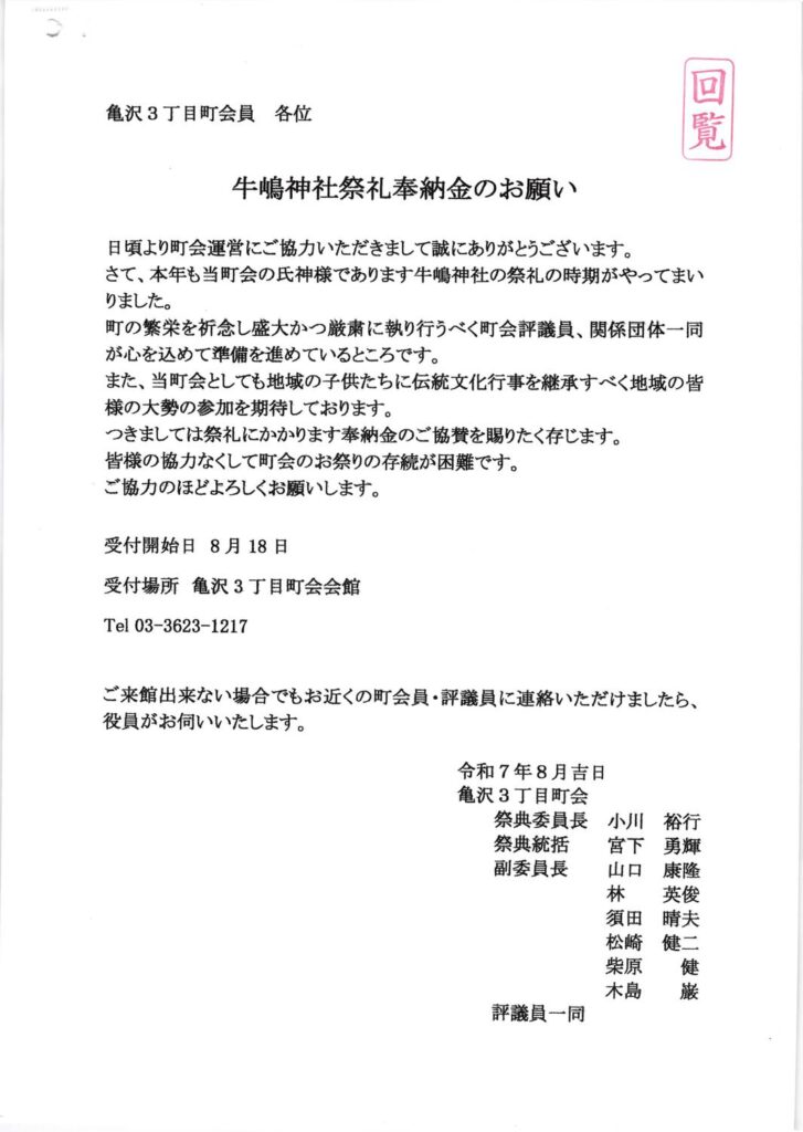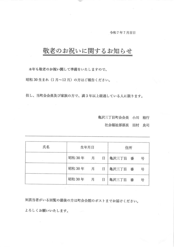 令和7年度 町会情報をお知らせいたします。 2025 9/25 2025 町会情報 2025年9月23日2025年9月25日 7月度評議員会報告 牛嶋神社祭礼奉納金のお願い 6月度評議員会報告 敬老のお祝いに関するお知らせ 本年も敬老のお祝いに関して準備いたします。昭和30年生まれ(1月~12月)の方はご報告ください。 令和7年度の廃品回収日程は以下の通りとなります。 令和6年度の町会情報はこちら▶▶▶ 2025 町会情報 令和7年度 牛嶋神社大祭 令和7年度_敬老会を開催しました。 関連記事 牛嶋神社祭禮 開催されました。 2025年10月12日 お知らせ:2025.4-2026.3 2025年10月11日 町会行事 バスハイク_2025 開催しました。 2025年9月30日 秋の体験型防災訓練のお知らせ_2025 2025年9月30日 令和7年度_敬老会を開催しました。 2025年9月25日 令和7年度 牛嶋神社大祭 2025年9月23日 町会行事 ランチ付きバスハイク_2025 開催します⇒定員に達しました 2025年7月22日 牛嶋神社祭礼 袢纏の貸し出しについてのお知らせ 2024年8月22日