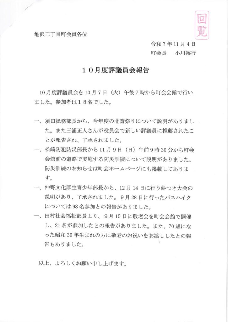 令和7年度 町会情報をお知らせいたします。 2025 11/11 2025 町会情報 2025年9月23日2025年11月11日 10月度評議員会報告 7月度評議員会報告 牛嶋神社祭礼奉納金のお願い 6月度評議員会報告 敬老のお祝いに関するお知らせ 本年も敬老のお祝いに関して準備いたします。昭和30年生まれ(1月~12月)の方はご報告ください。 令和7年度の廃品回収日程は以下の通りとなります。 令和6年度の町会情報はこちら▶▶▶ 2025 町会情報 令和7年度 牛嶋神社大祭 令和7年度_敬老会を開催しました。 関連記事 牛嶋神社祭禮 開催されました。2025③ 2025年11月12日 町会行事 体験型秋の防災訓練_2025 参加しました。 2025年11月11日 牛嶋神社祭禮 開催されました。2025② 2025年10月27日 北斎まつり~弘前ねぷた運航 警備のお手伝いをしました。~ 2025年10月27日 牛嶋神社祭禮 開催されました。2025① 2025年10月12日 お知らせ:2025.4-2026.3 2025年10月11日 町会行事 バスハイク_2025 開催しました。 2025年9月30日 秋の体験型防災訓練のお知らせ_2025 2025年9月30日