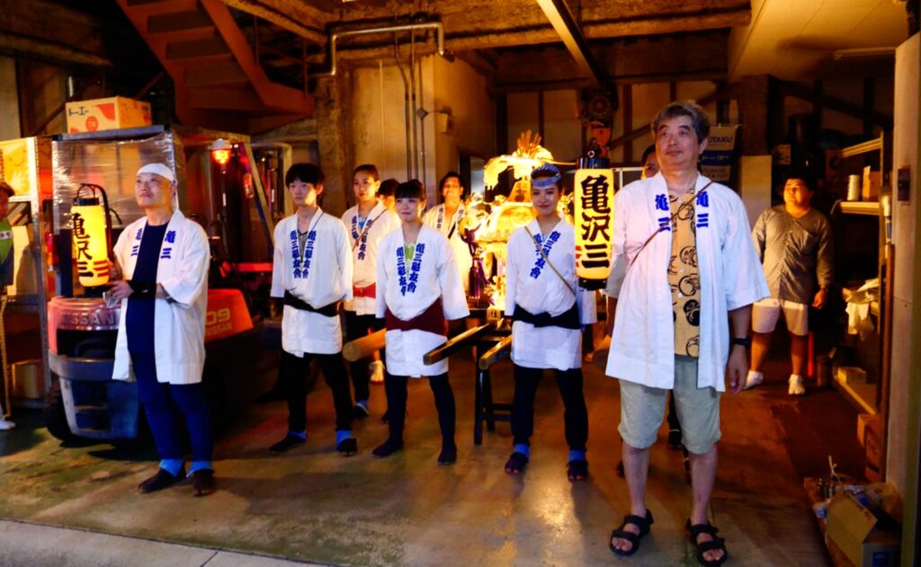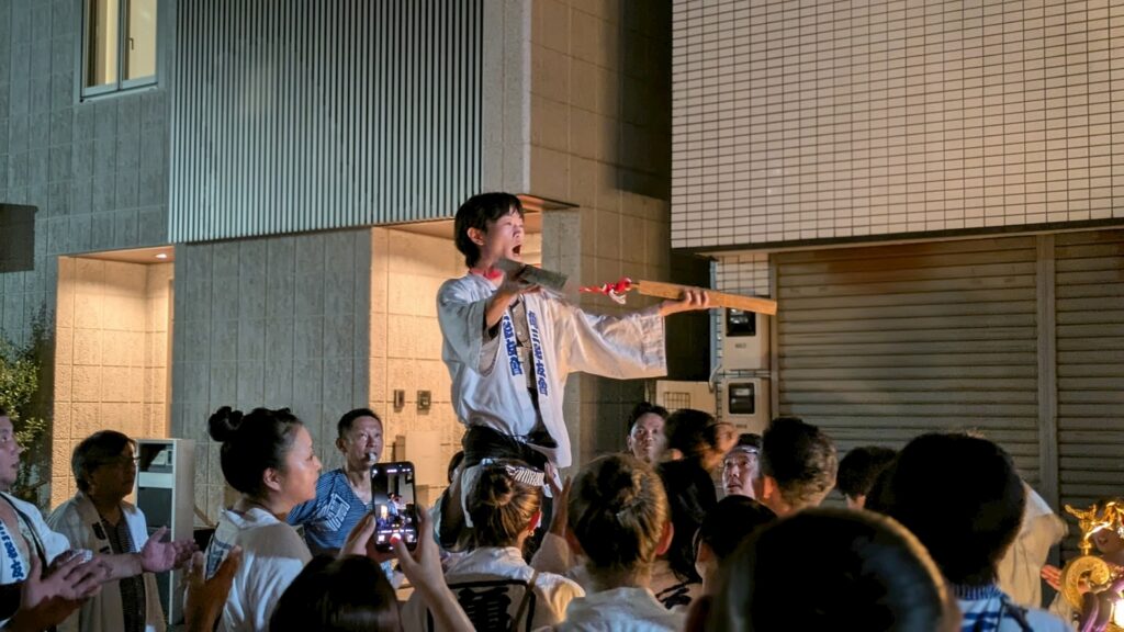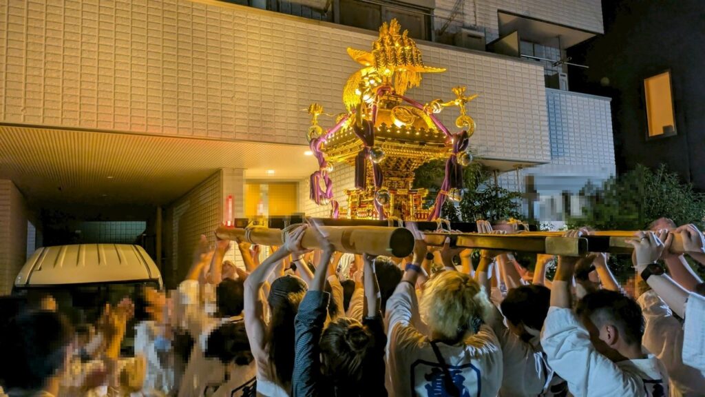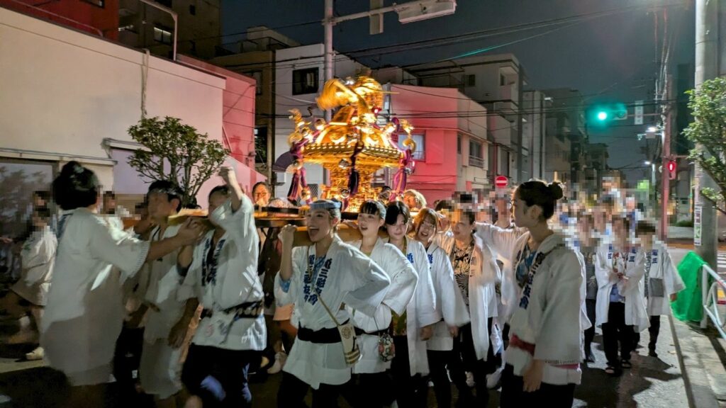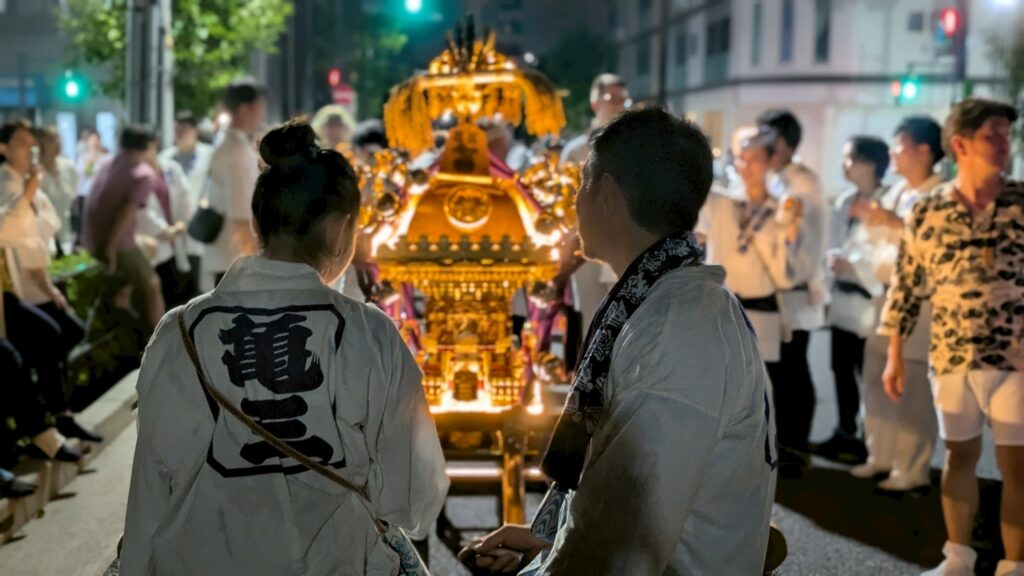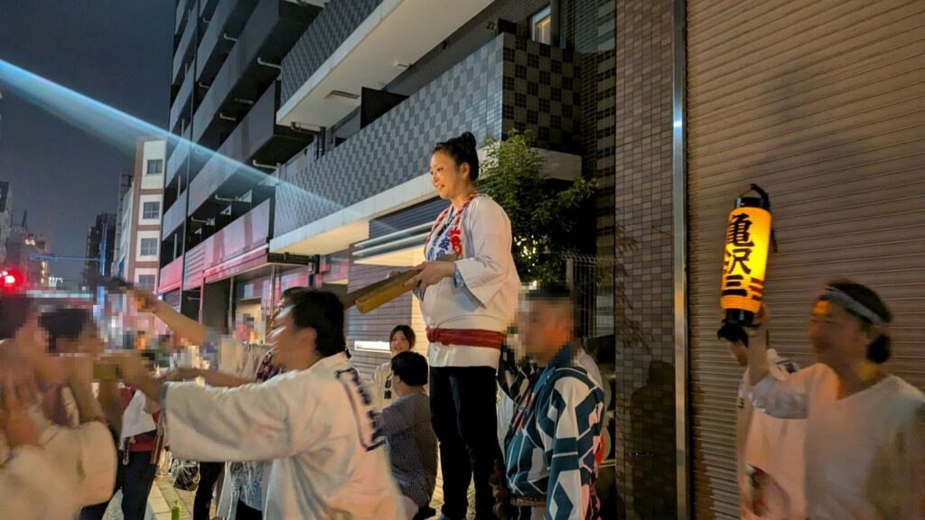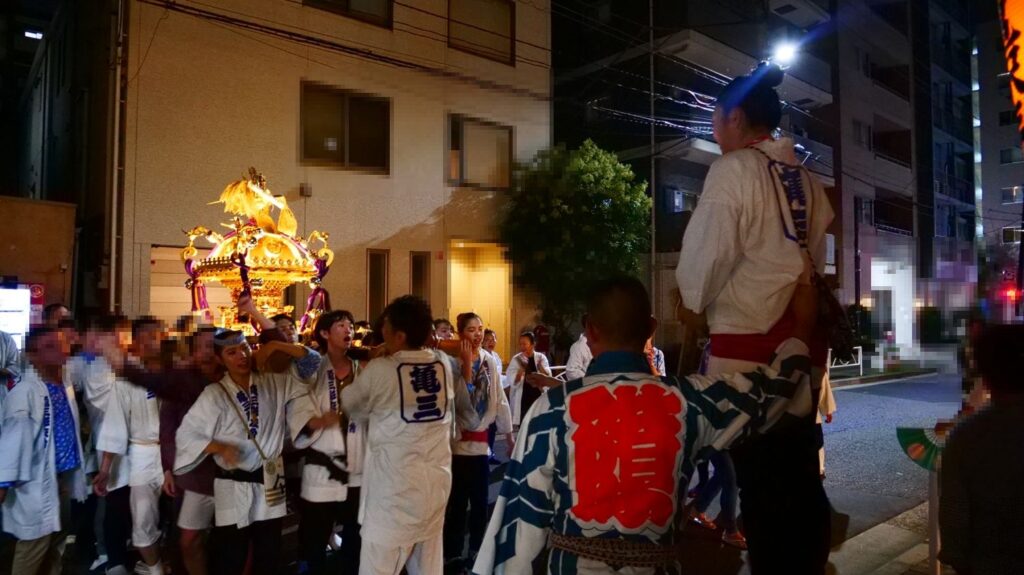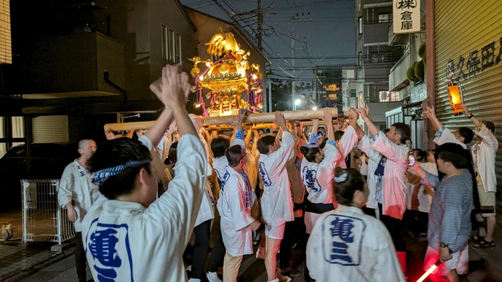 宵宮 亀沢三丁目の法被を着て神輿を担ぎ、お祭が始まります。提灯も輝いています。