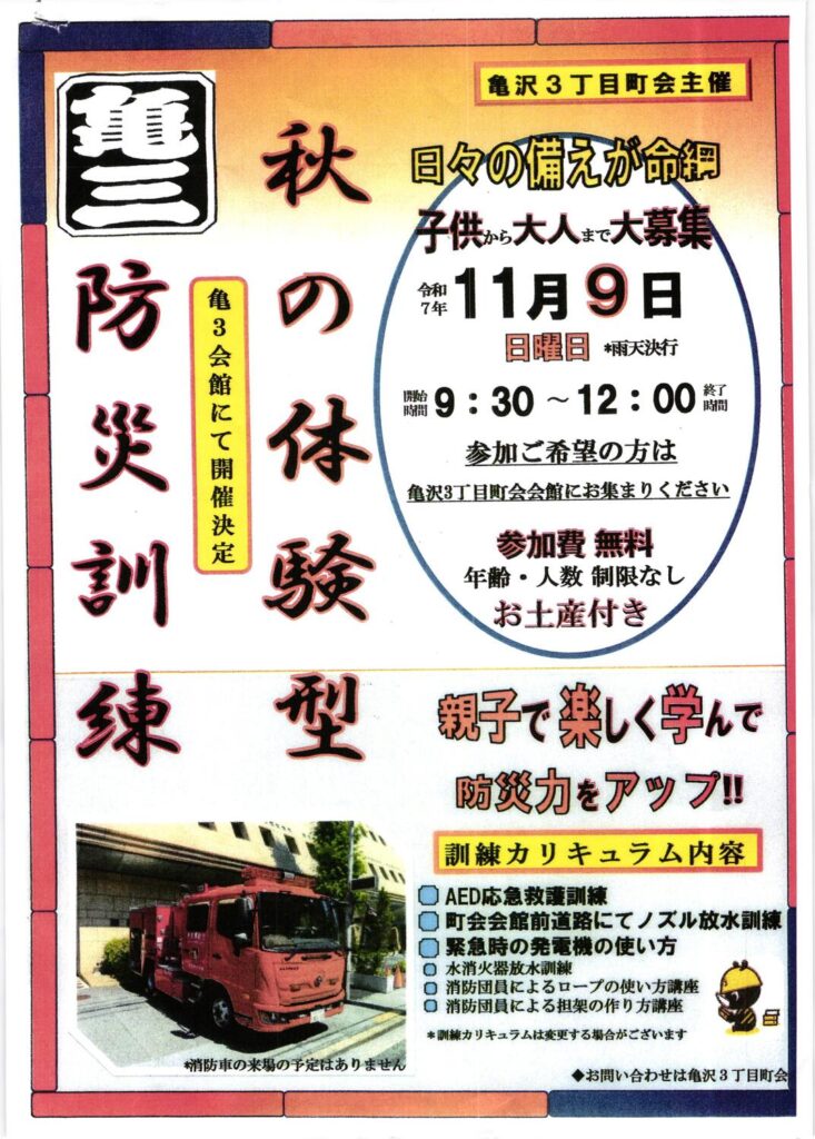 秋の体験型防災訓練のお知らせ_2025 2025 9/30 2025 町会行事 2025年9月30日 秋の防災訓練が開催されます。ぜひご参加ください!日にち 11月9日 日曜日時間 9:30-12:00参加費無料 年齢・人数制限なし お土産付きです 2025 町会行事 令和7年度_敬老会を開催しました。 町会行事 バスハイク_2025 開催しました。 関連記事 牛嶋神社祭禮 開催されました。 2025年10月12日 お知らせ:2025.4-2026.3 2025年10月11日 町会行事 バスハイク_2025 開催しました。 2025年9月30日 令和7年度_敬老会を開催しました。 2025年9月25日 令和7年度 町会情報をお知らせいたします。 2025年9月23日 令和7年度 牛嶋神社大祭 2025年9月23日 町会行事 ランチ付きバスハイク_2025 開催します⇒定員に達しました 2025年7月22日 新年会が開催されました! 2025年2月10日