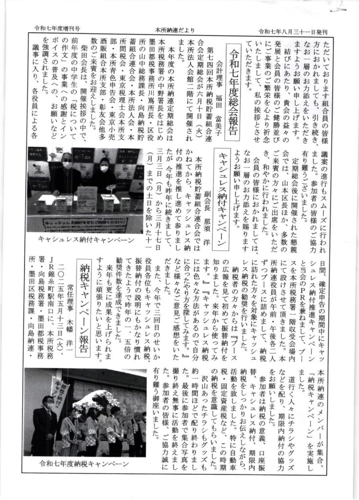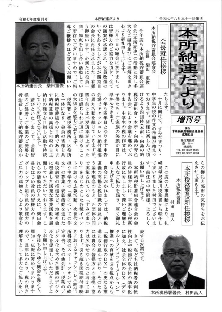 ・会長就任挨拶 ・本所税務署長信任挨拶 ・令和7年度総会報告